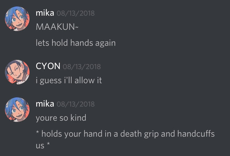 you were there for me at my worst (ons on main) and now youre here at my worserest (fushimi on main lol). weve been handcuffed for 2 1/2 months, but id rather be handcuffed with no one else. when you slapped me those three times, i felt emotions i didnt know were unlockable outside of animal crossing. you complete my kindates every time. you complete... me <3